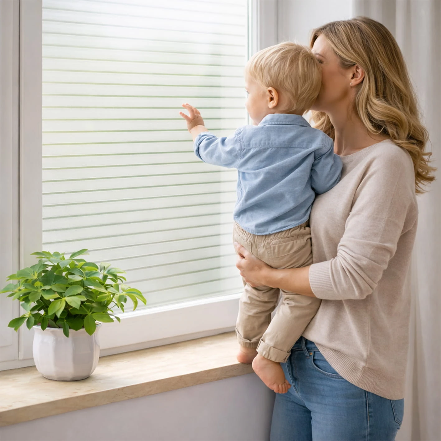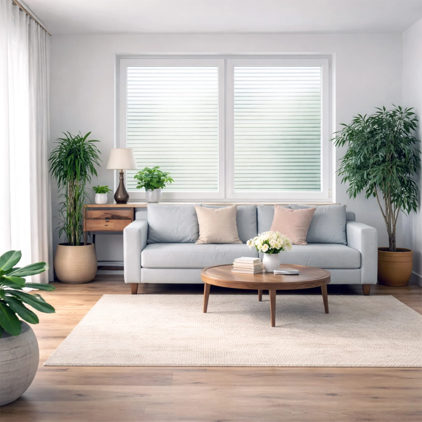 Folia rozprasza światło i ogranicza bezpośrednią widoczność wnętrza, nie powodując efektu pełnego zaciemnienia. Pomieszczenie pozostaje dobrze doświetlone, a jednocześnie bardziej komfortowe w codziennym użytkowaniu.