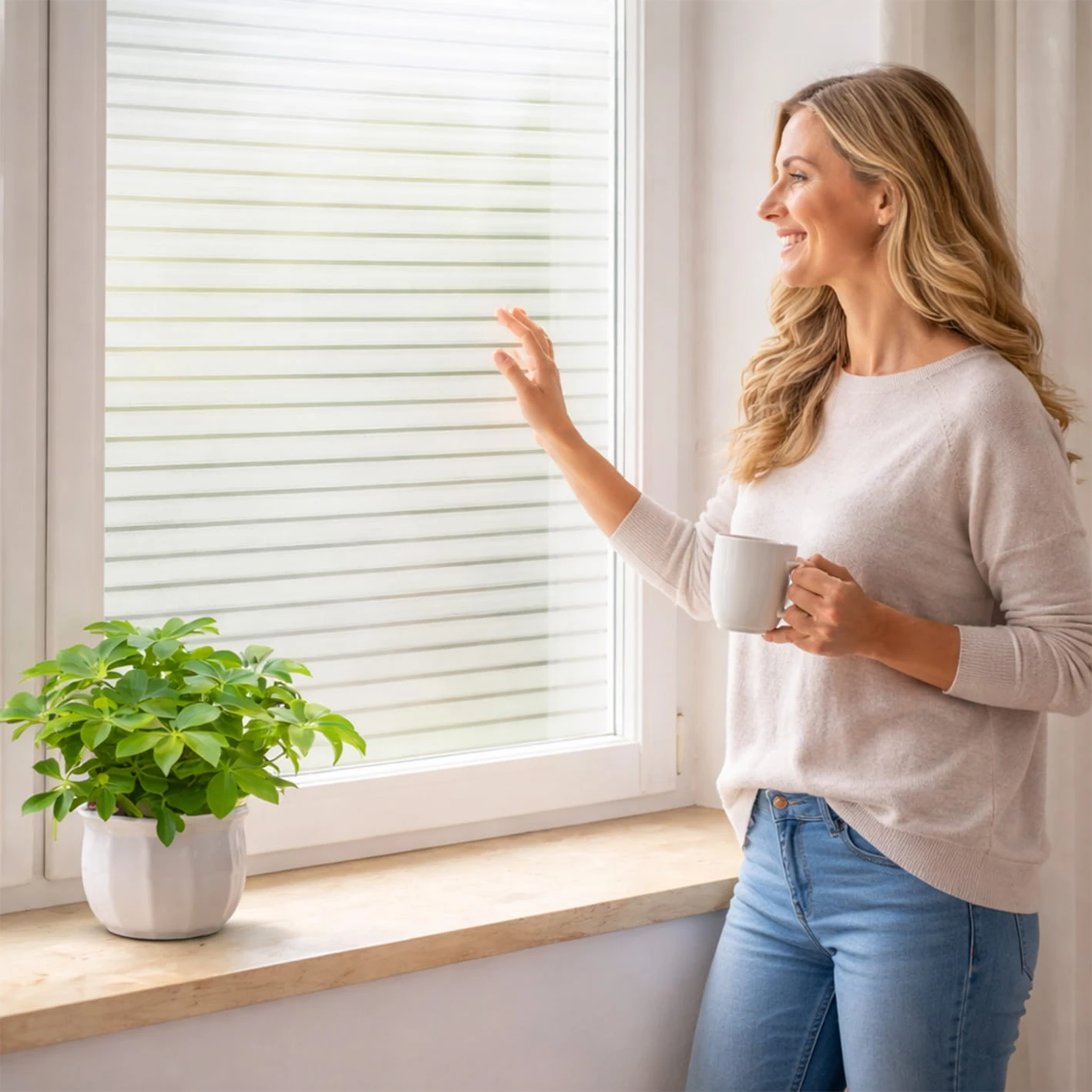 Nowoczesna folia dekoracyjna z pionowymi paskami o szerokości 1 cm to praktyczne rozwiązanie do wnętrz, w których liczy się estetyka, prywatność i dostęp światła dziennego. Subtelny efekt szronu nadaje szybom elegancki wygląd i pomaga ograniczyć bezpośredni wgląd do pomieszczenia.